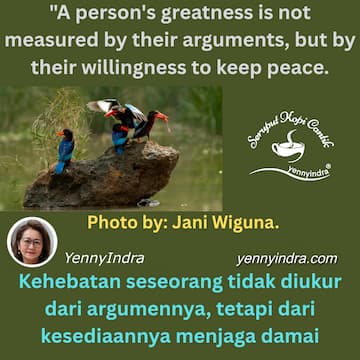 Orang yang bijak tahu kapan harus bicara dan kapan harus diam. Mereka tidak sibuk mencari kemenangan kecil dalam debat, tetapi fokus menjaga damai yang lebih besar. Menang argumen hanya memuaskan ego sesaat, tetapi merusak hubungan jangka panjang. Orang di sekitar kita justru lebih menghargai mereka yang memilih damai daripada yang sibuk membuktikan diri.