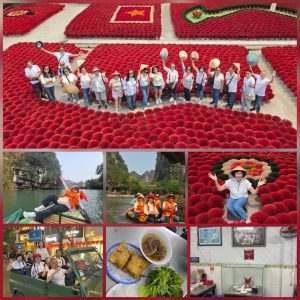 Hari itu kami memulai perjalanan ke Quang Phu Cau Incense Village. Desa kecil ini tidak biasa. Begitu melangkah masuk, mata langsung disambut lautan merah. Ribuan batang dupa disusun rapi, membentuk pola seperti bunga raksasa yang terbuka sempurna. Cantik… dan memukau.