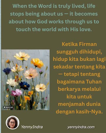 Waktu mulai melangkah, waktu mulai berbicara, waktu mulai setia melakukan bagian saya, sesuatu terjadi. Bukan karena saya tiba-tiba merasa kuat, tapi karena Tuhan setia pada janji-Nya.